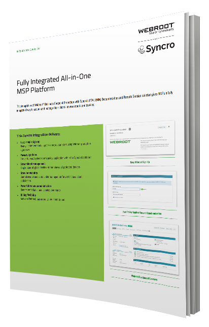 The Webroot integration with Syncro’s combined PSA, RMM, documentation and remote session solution gives MSPs an all-in-one platform to secure and manage their clients’ environments and devices.